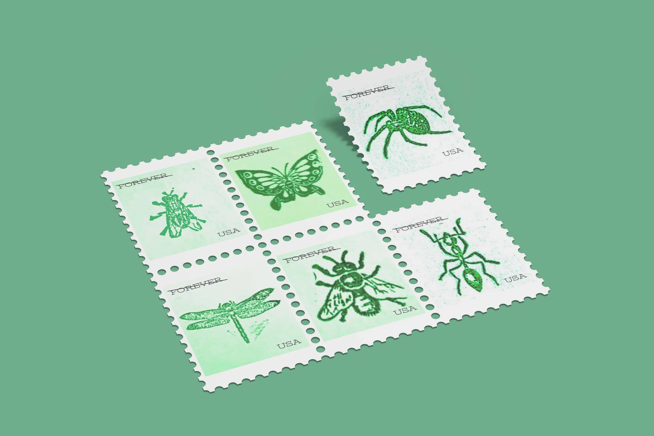 A postage stamp series of insects inspired by greenery and nature. I carved the intricate insect design from rubber and stamped them on paper. The green colour scheme gives the sensibility of nature without it being too obvious.